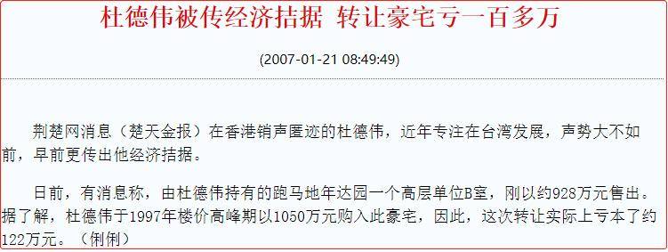 相反地,浪荡多年的杜德伟,因事业陷入低谷,又常年如脱缰的野马流连花丛中,港媒报道,他日子越过越落魄,无戏可拍,为了维持生计,甚至不得不低价卖掉豪宅套现……
